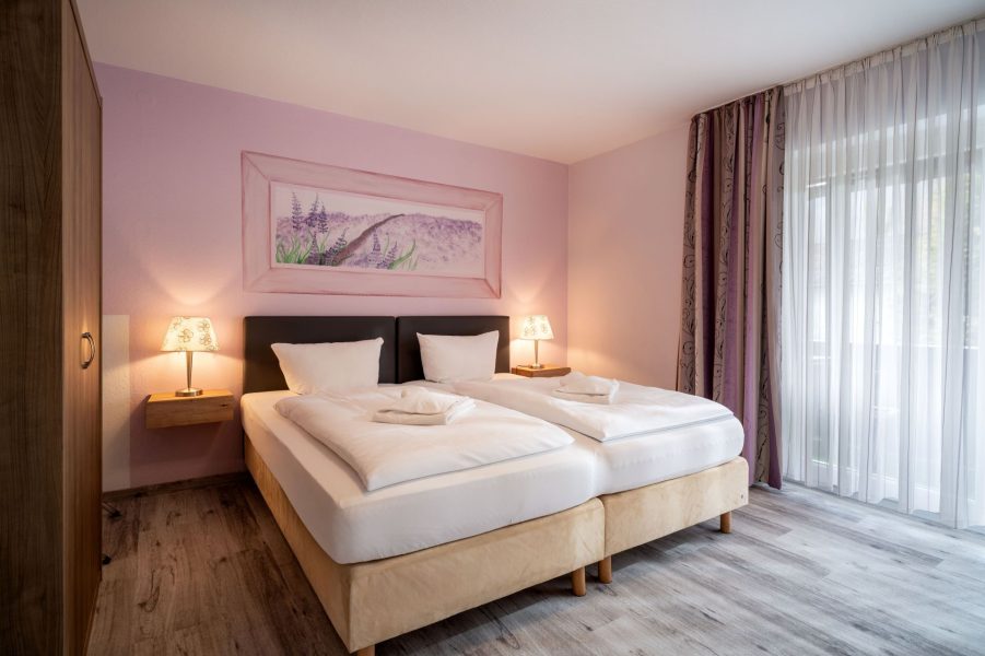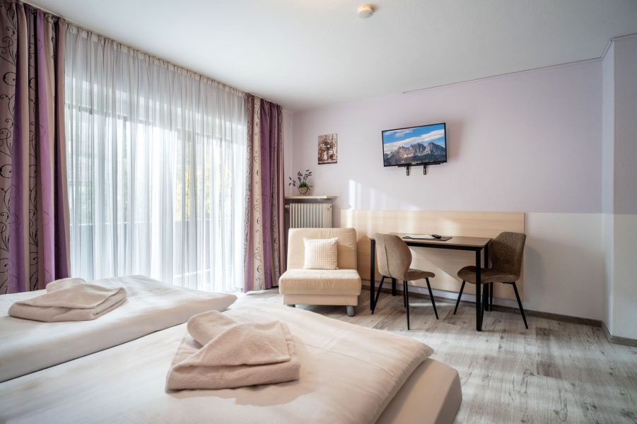 Das Dreibettzimmer Lavendel verfügt über ein Boxspringbett mit 200/210 und einen Schlafsessel 90/200 zum Ausziehen für die 3. Person. Das renovierte Bad/WC befindet sich gegenüber vom Zimmer und ist zur alleinigen Benutzung. Zum Verweilen steht Ihnen ein Balkon mit dem Blick in die Berge zur Verfügung. Das Zimmer ist mit Flachbildschirm und WLAN ausgestattet.